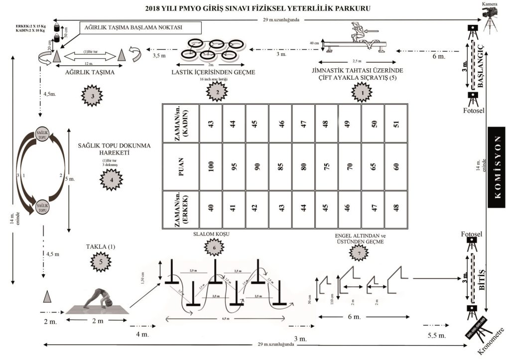 - Ağırlık taşıma, erkek adaylar için 30 Kg (15×2) ağırlığındaki, kadın adaylar için 20 Kg (10×2) iki kum torbasını aralarında 12 metre mesafe bulunan iki dubanın dışından dolaşarak taşıyacak ve ağırlıkları taşımaya başladığı noktaya herhangi bir mesafeden atmayacak, aldığı noktaya bırakacaktır.