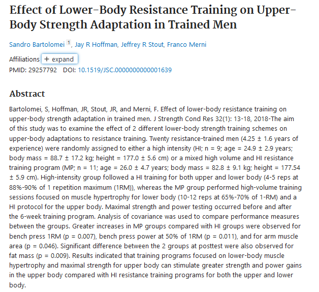 Effect of Lower-Body Resistance Training on Upper-Body Strength Adaptation in Trained Men, https://pubmed.ncbi.nlm.nih.gov/29257792/