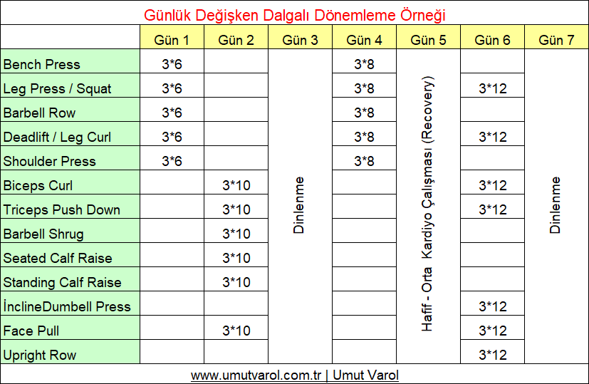 Maksimal kuvvet çalışmalarının 1-8 tekrar aralığında ve hipertrofi çalışmalarının 9-15 tekrar aralığında yapıldığını biliyoruz. Öyleyse aynı hafta içerisinde bu iki değişik tipte çalışmayı kullanabiliriz. Böylelikle günlük değişkenli dalgalı bir dönemleme elde ederken, her ikisinin faydalarından yararlanmış oluruz. İyi bir gelişim elde etmek ve evrimi yükseltmek için bir kasın haftada 2 veya 3 defa çalıştırılmasının, haftada bir defa çalıştırılmasına göre daha üstün olduğunu da biliyoruz. Şimdi yukarıda bahsettiğimiz bir sürü parçayı birleştirelim.